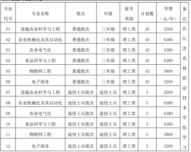 2021年江苏大学和江苏农林职业技术学院联合培养专转本学生300人,联合培养专业有设施农业科学与工程、农业机械化及其自动化、农业电气化、食品科学与工程、物联网工程、电子商务等。具体各专业招生计划及学费如下
