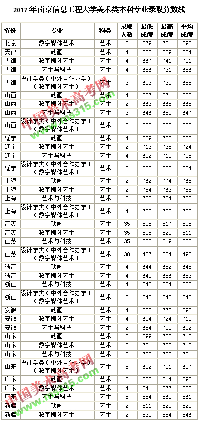南京信息工程大学2017年江苏省美术类本科招生计划