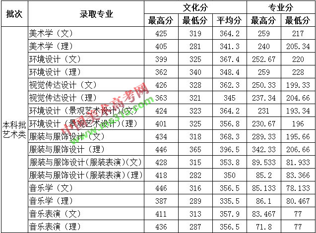 对进档考生,美术学、视觉传达设计、环境设计、环境设计(景观艺术设计)、服装与服饰设计、音乐学、音乐表演、服装与服饰设计(服装表演方向)专业按专业成绩从高分到低分择优录取(专业成绩相同者,按文化课成绩从高到低择优录取)。