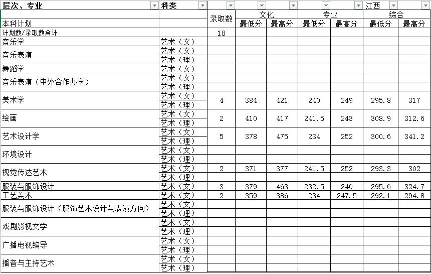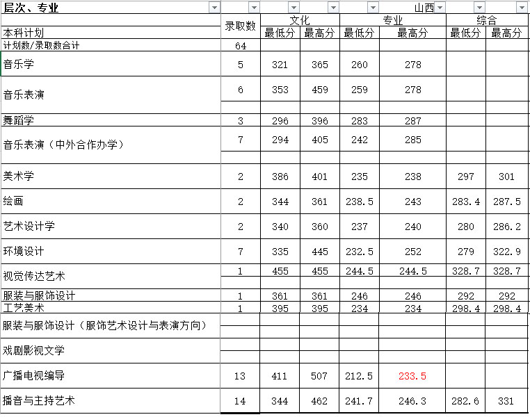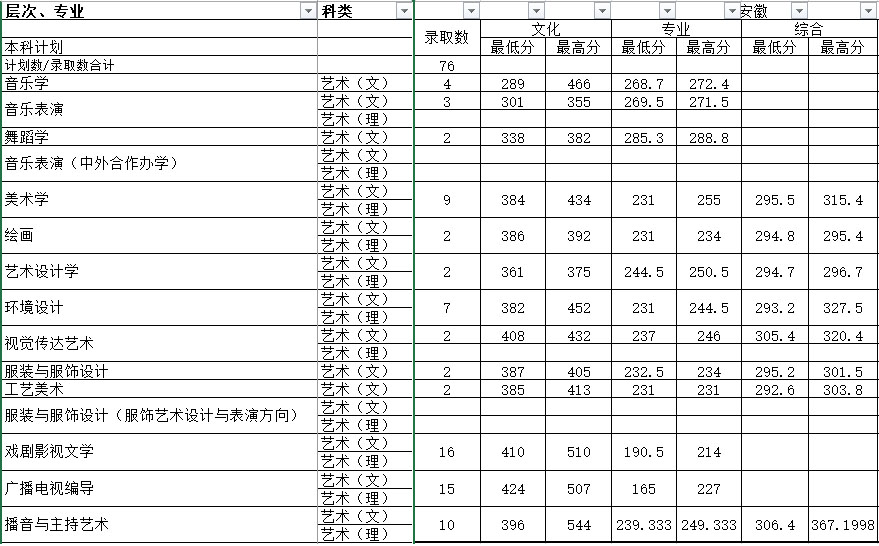 美术学、艺术设计学、绘画、工艺美术、服装与服饰设计、视觉传达设计、环境设计、播音与主持艺术专业按综合成绩从高到低录取(综合成绩=校考专业分数×60%+高考文化分数×40%)。综合成绩相同时,校考专业分数高者优先;