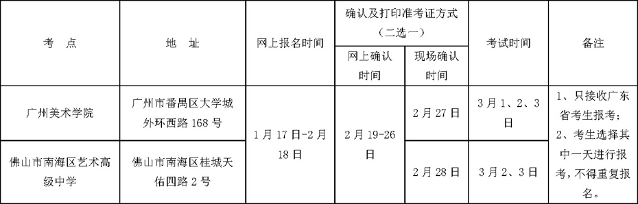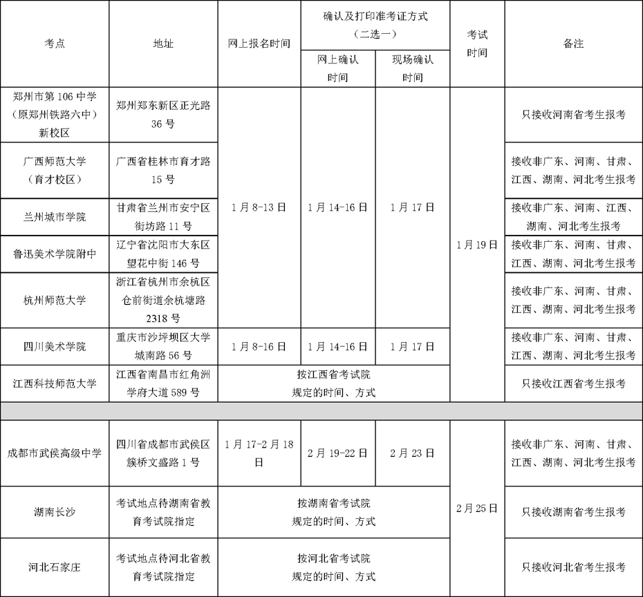 2、除美术学专业(美术史、艺术管理与策划培养方向)、书法学专业,其他各美术类校考专业在广东省内的考点安排如下: