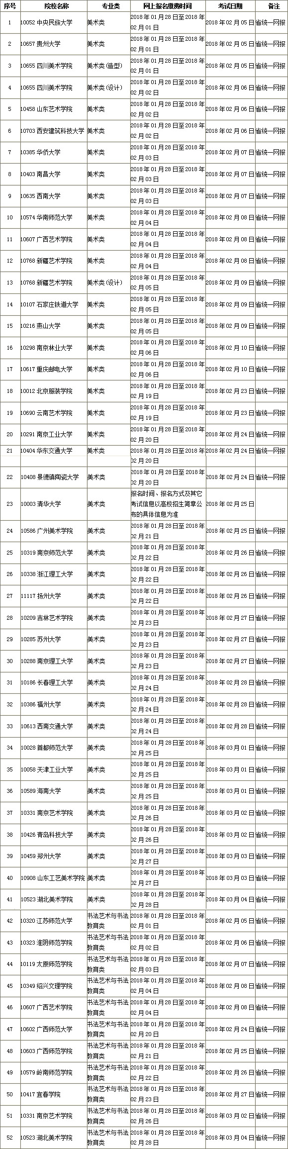 一、美术(含设计)类、书法类报考安排表(2018年)