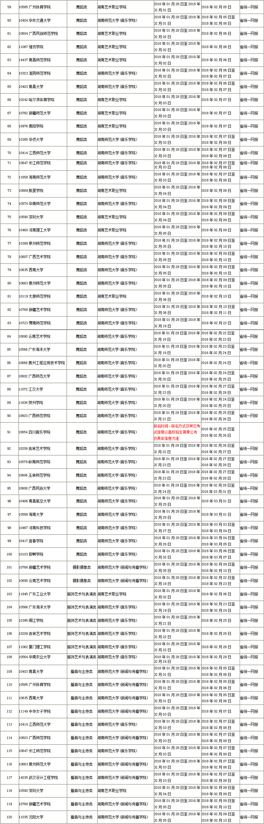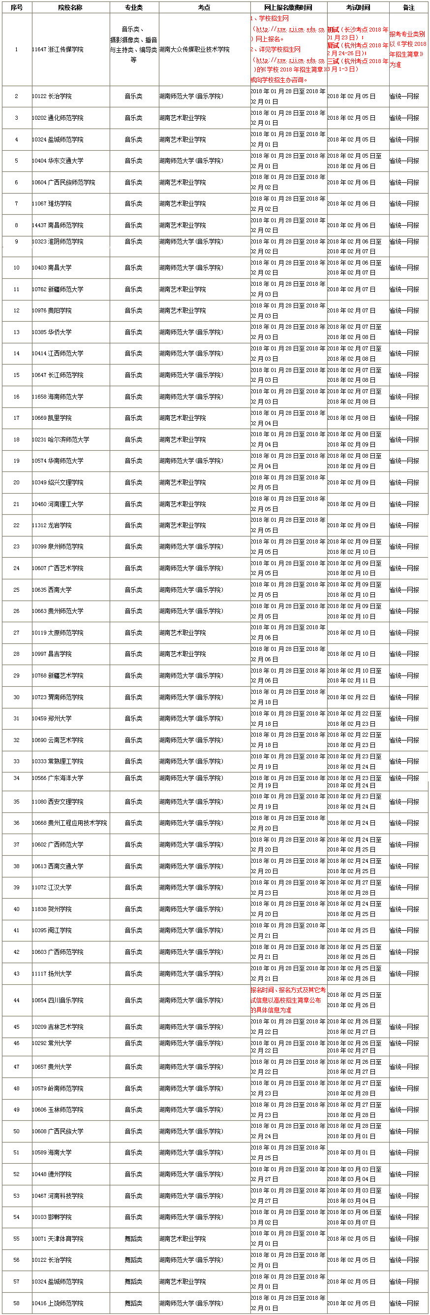 2018年省外高校来湘组织艺术类专业校考考点及时间安排表