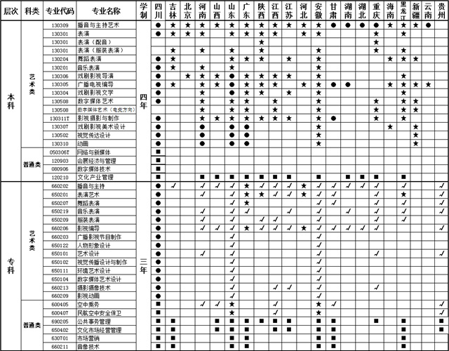 √代表该省设有相关艺术类专科专业招生计划。专业成绩均认定当地联考或统考成绩,录取原则按四川省内的录取原则执行;如当地无相关艺术类专业的联考或统考,则该专科层次的专业考试成绩认可方式以生源地省、市招生考试院公布为准。