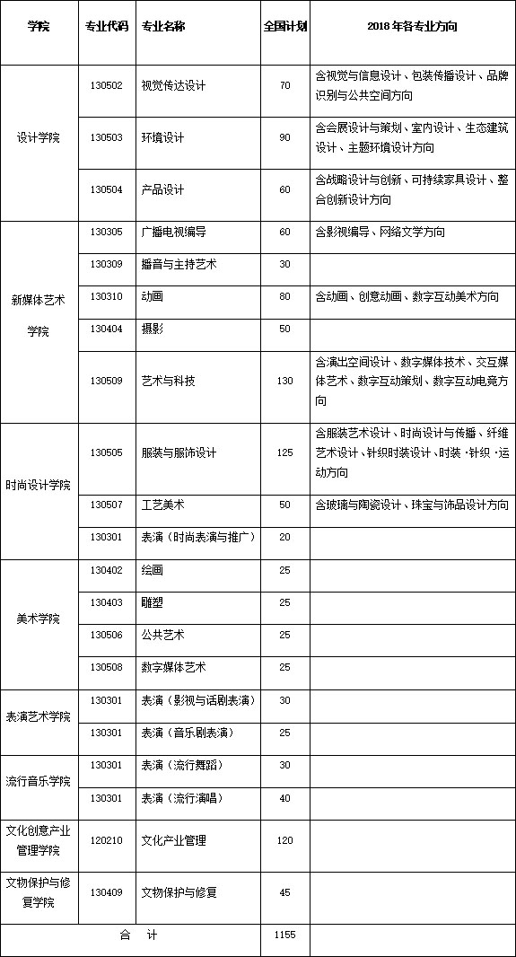 我校2018年各招生专业中,视觉传达设计、产品设计、环境设计、艺术与科技、数字媒体艺术、动画、工艺美术、服装与服饰设计、雕塑、绘画、公共艺术和文物保护与修复专业,需参加所在省市美术类统考,招生面向上海、江苏、浙江、安徽、山东、河南、辽宁、黑龙江、河北、湖南、四川、广东、贵州、吉林、新疆等省市。摄影、广播电视编导、播音与主持艺术、表演专业需参加我校校考,面向全国各省市招生,如所在省市有相关统考要求的,需在专业类统考合格的基础上,参加校考。