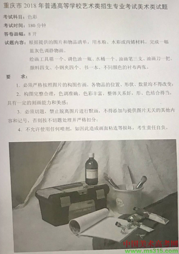 2018重庆美术联考色彩考题 艺考 • 2023-06-19 15:27:51 • 专栏 2018年重庆美术联考色彩(静物)科目考试2017年12月10日14:00-17:00举行,满分100分,具体考题如下图: 本文由用户:艺考 投稿分享,如有侵权请联系我们(点击这里联系)处理,若转载,请注明出处:http://xueli.yktime.cn/42945.html 赞 (0) 艺考 0 生成海报 相关推荐 2018年上海市艺术类专业招生实施办法 2018年上海市普通高校艺术类专业招生实施办法 根据教育部有关艺术类专业招生文件精神,结合本市普通高校艺术类专业招生的具体情况,现制定《2018年上海市普通高校艺术类专业招生实… 专栏 2023-06-19 00 2022年重庆师范大学有专升本吗? 为了规范学校招生行为,维护考生合法权益,保障普通生“专升本”招生工作顺利进行,根据重庆市教委《2022年重庆市普通高校“专升本”考试招生工作实施方案》等文件精神,结合学校实际,经我… 专栏 2023-06-19 00 河北省217年艺术类院校专业课校考规定 1.独立设置的本科艺术院校和本科一、二批次高校(民办院校和独立学院除外,下同)的艺术类本科专业,联考未涉及的艺术类本、专科专业,经我省教育考试… 专栏 2023-06-19 00 2018山西音乐舞蹈统考合格分数线 凡我省普通高考音乐及舞蹈类考生,省级统考总成绩不低于音乐62.00分、舞蹈60.00分,均有资格参加外省本科院校组织的音乐及舞蹈类专业校考。 专栏 2023-06-19 00 汉江师范学院2021年专升本流程 库课小编今天给大家分享一下2021年汉江师范学院普通专升本流程,有要报考该院校的专升本考生们可以看看。 5月20日至21日,打开“汉江师范学院普通专升本考试报名系统”(ht… 专栏 2023-06-19 00 2021山东华宇工学院专升本建档立卡投档线 山东华宇工学院是山东省专升本建档立卡招生院校之一,2021年山东华宇工学院专升本招收建档立卡考生的专业有哪些?各专业最低投档分数线是多少呢? 2021年山东华宇工学院专升本建档… 专栏 2023-06-19 00 烟花爆竹技术与管理专业就业方向? 本专业主要就业去向为:环境监测站和厂矿企业的环保部门从事环保管理、安全技术管理与监察、灾害预防与控制等工作。政府安全生产监督管理部门、安全咨询服务公司. 烟花行业的电子商务的实现中… 专栏 2023-06-19 00 白酒酿造工程专业就业前景如何? 毕业生可在酿酒科学与工程领域内从事教学、科学研究与开发、生产管理、检验、产品营销与技术服务等工作,也可以考研或出国深造。 川大锦江的酿酒专业是一个2011年设立的新专业,专业培养白… 专栏 2023-06-19 00 发表回复 您的邮箱地址不会被公开。 必填项已用 * 标注*昵称: *邮箱: 网址: 记住昵称、邮箱和网址,下次评论免输入 提交