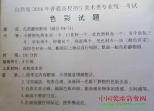 2018山西美术联考色彩考题 艺考 • 2023-06-19 15:27:53 • 专栏 2018山西美术联考色彩考试12月17日上午8:30―11:30举行,考试时长3小时,考试满分100分。具体考试题目如下: 本文由用户:艺考 投稿分享,如有侵权请联系我们(点击这里联系)处理,若转载,请注明出处:http://xueli.yktime.cn/42964.html 赞 (0) 艺考 0 生成海报 相关推荐 2018江汉大学美术类校考时间 江汉大学2018年美术类校考报名与考试时间、地点 校考考试科目与要求 备注:上海考生可兼考美术类和设计类,其中默写为公共考试科目,只需一次考试。 &nb… 专栏 2023-06-19 00 2022年江西艺术职业学院有哪些专业 为您整理了2022年江西艺术职业学院有7个热门专业,专业数据来源网络供参考,专业介绍、收费标准请江西艺术职业学院官网公布为准。 江西艺术职业学院开设的专业: 1、舞蹈表演 2、音乐… 专栏 2023-06-19 00 2018年西安石油大学艺术类本科分省分专业招生计划 2018年西安石油大学艺术类本科分省分专业招生计划 录取原则 1.设计学类:在文化课、专业课统考成绩均合格的基础上,按专业课统考成绩由高到低择优录取。 2.音乐学:在文化课、专… 专栏 2023-06-19 00 2022年南京交通职业技术学院提前招生有什么专业(提前招生学费多少) 专栏 2023-06-19 00 2022年重庆艺术学校有哪些专业 为您整理了2022年重庆艺术学校有4个热门专业,专业数据来源网络供参考,专业介绍、收费标准请重庆艺术学校官网公布为准。 重庆艺术学校开设的专业: 1、舞蹈表演 2、音乐 3、戏剧表… 专栏 2023-06-19 00 2022年丽水护士学校有哪些专业 为您整理了2022年丽水护士学校有5个热门专业,专业数据来源网络供参考,专业介绍、收费标准请丽水护士学校官网公布为准。 丽水护士学校开设的专业: 1、舞蹈表演 2、音乐 3、美术设… 专栏 2023-06-19 00 2022年金平县职业高级中学有哪些专业 为您整理了2022年金平县职业高级中学有10个热门专业,专业数据来源网络供参考,专业介绍、收费标准请金平县职业高级中学官网公布为准。 金平县职业高级中学开设的专业: 1、电子商务 … 专栏 2023-06-19 00 2018年河南财经政法大学省外艺术类专业合格线 美术类合格分数线(素描成绩+色彩成绩)分别为:江苏省:248分,山西省:245分,广西壮族自治区:242分。  … 专栏 2023-06-19 00 发表回复 您的邮箱地址不会被公开。 必填项已用 * 标注*昵称: *邮箱: 网址: 记住昵称、邮箱和网址,下次评论免输入 提交