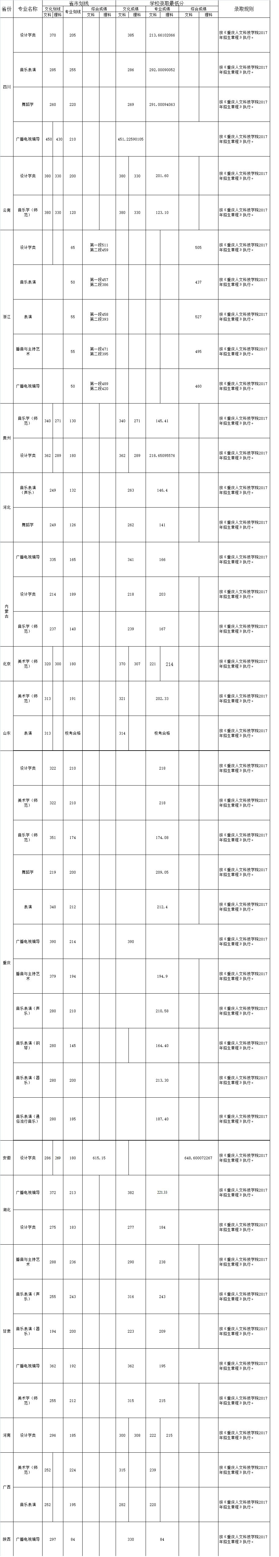 (一)2017年重庆人文科技学院艺术类专业的专业考试成绩采用相关省(自治区、直辖市)专业统考(联考)成绩。考生文化、专业考试成绩须达到所在省(自治区、直辖市)招生主管部门划定的同批控制分数线。 美术类、音乐学、音乐表演、舞蹈学、播音与主持艺术、表演专业的进档考生按照专业成绩从高到低录取,专业成绩相同者按文化成绩从高到低录取,如文化成绩仍相同,则按语文、外语单科顺序及分数从高到低录取。广播电视编导专业的进档考生按照文化成绩从高到低录取,文化成绩相同者按专业成绩从高到低录取,如专业成绩仍相同,则按语文、外语单科顺序及分数从高到低录取。