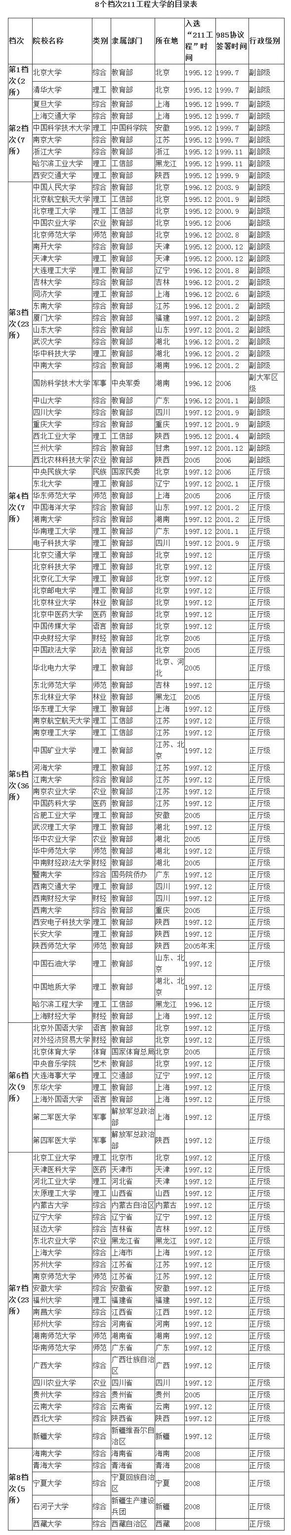 由此可见,112所211工程大学也是有三六九等的。根据不同211工程大学的办学实力及其在政府心目中地位的不同,本文将112所211工程大学分为8个“档次”,其中前4个档次为211工程大学中的985工程大学,共39所;后4个档次为211工程大学中的非985工程大学,共73所。本文特以表格形式列出,仅供考生和家长在挑选学校时参考。