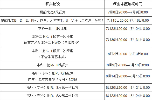 本科提前批a段、 b段、c段、d段、e段、f段、g段,本科一批h段、i段、j段,本科二批k段、l段,高职(专科)批p段、q段,体育、艺术类本科一批(t段、u段、v段),体育、艺术类本科二批(w段)。
