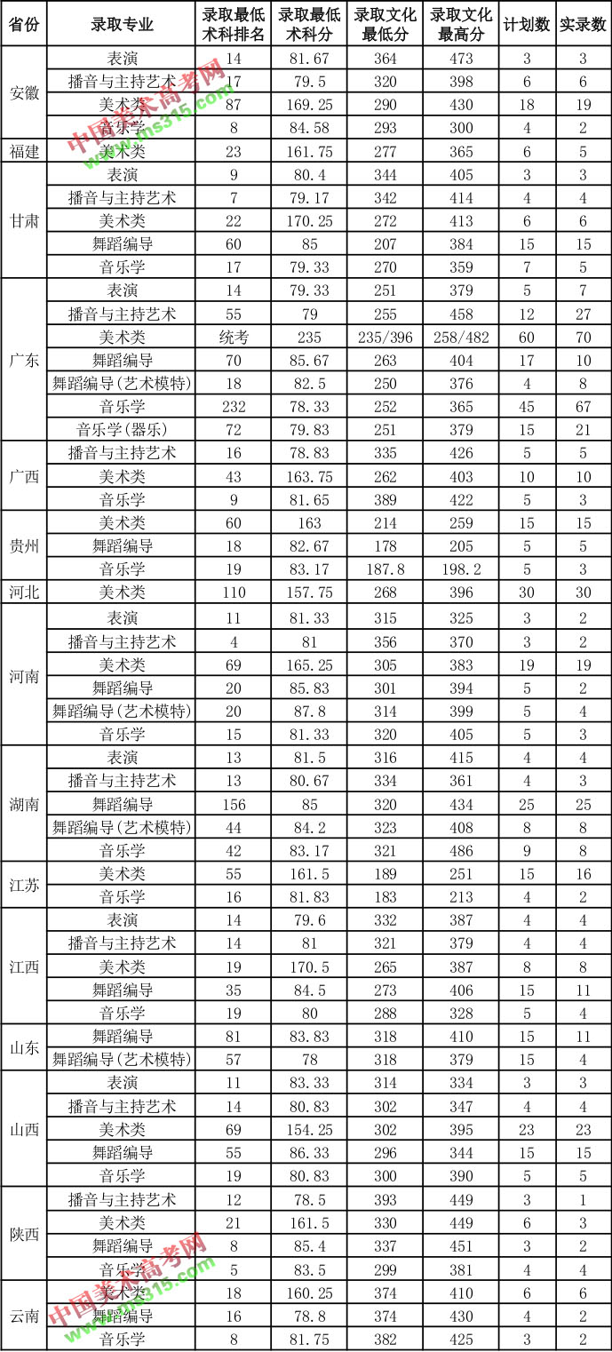 艺术类(音乐类、美术类)专业招生录取时,在考生思想政治品德考核与身体健康状况检查合格的基础上,考生参加“普通高等学校招生全国统一考试”的成绩达到生源所在省(自治区、直辖市)相关层次最低控制分数线的情况下,按照各省(自治区、直辖市)招生部门要求,凡规定考生须取得所在省组织的艺术专业统考合格(证)才能报考的,考生必须持有所在省(自治区、直辖市)艺术专业统考合格证方可填报志愿。我校音乐学、舞蹈编导、表演、播音与主持艺术和美术类(非广东省生源)等校考专业按照综合成绩择优录取。综合成绩=(术科成绩÷术科总分)×70+(文化课成绩÷文化课总分)×30,其中,美术类专业术科总分为200分,非美术类专业术科总分为100分。体育类和广东省美术类专业的考生按综合成绩(文化课成绩×30%+术科统考成绩×70%)从高到低择优录取。按照山西省招生考试管理中心的规定,如需征集志愿录取,在“文化成绩达线、校考专业成绩合格”生源范围内征集志愿后仍未完成招生计划,一律按照在“文化成绩达线、山西省相应专业统考(联考)成绩合格”生源范围内征集志愿,直至完成招生计划。