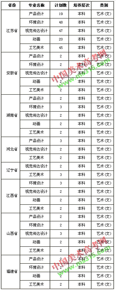 南京工程学院2018年面向江苏、安徽、湖南、河北、辽宁、江西、山西、福建等省计划招收工艺美术、视觉传达设计、产品设计、环境设计、动画等5个专业学生240名(分省分专业招生计划以各省公布的招生计划为准),学制四年(本科),按艺术类招生。艺术类专业学费6800元/年・生,学生四年在校学习期间需自备部分学习工具及材料。