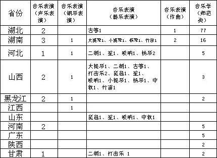 3. 音乐表演专业(器乐表演)乐器种类:二胡、笙、唢呐、竹笛、古筝、琵琶、扬琴、大提琴、小提琴、阮和民族打击器。