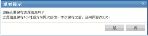 7.考生志愿保存一小时后方可修改志愿,在该批志愿填报截止时间前有两次修改并保存志愿的机会。
