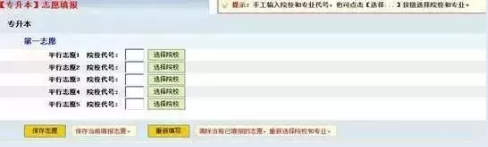如上图就是操作界面。我们专升本的考生手动输入院校代号和专业代号。每年个别专业的专业代号和往年不一样,需要特别注意。