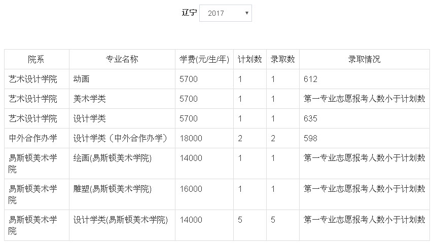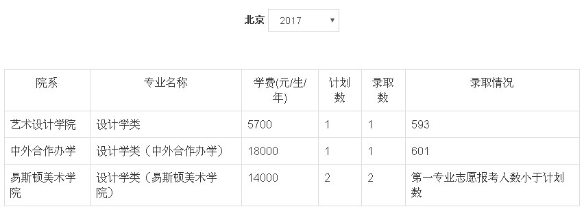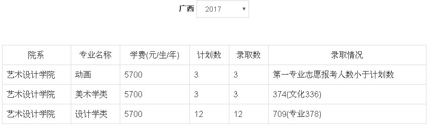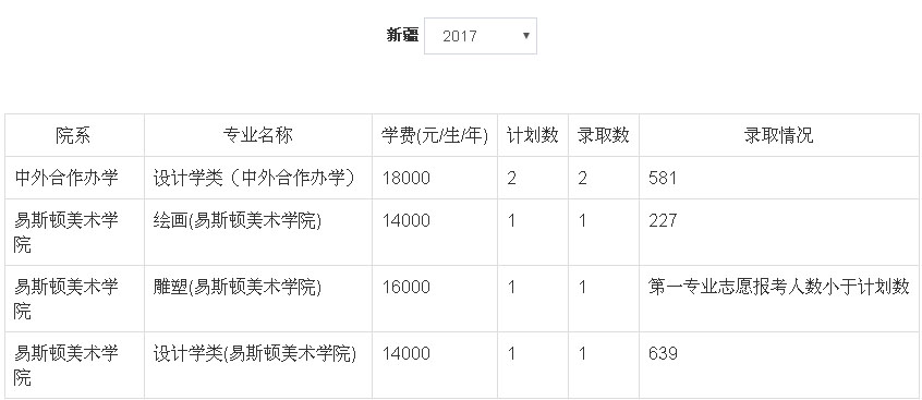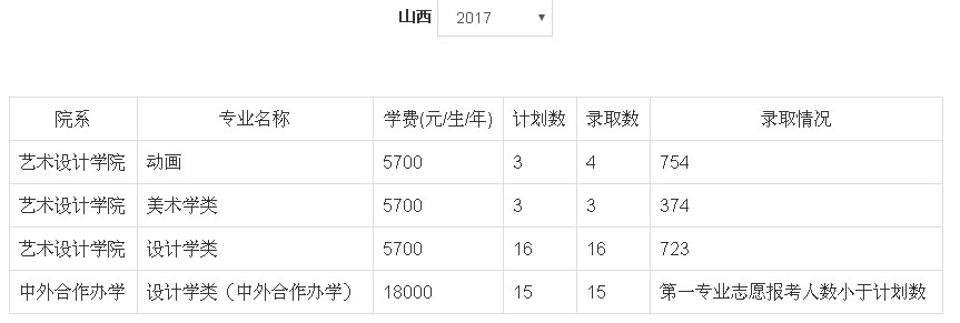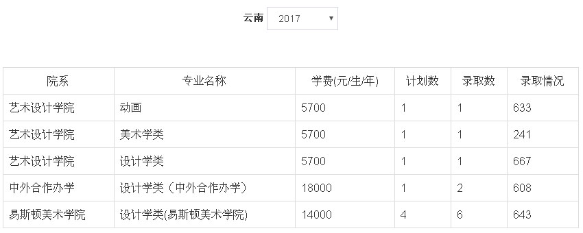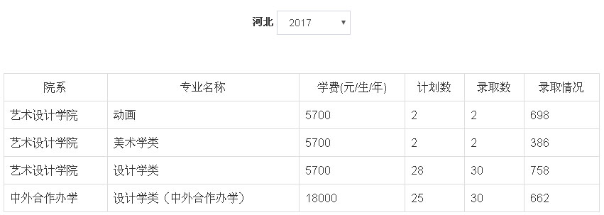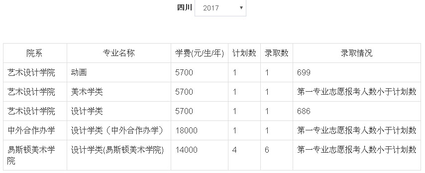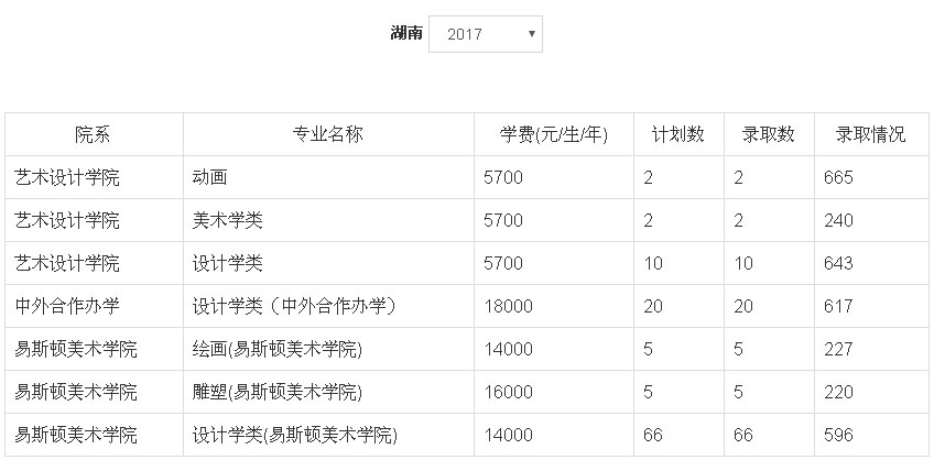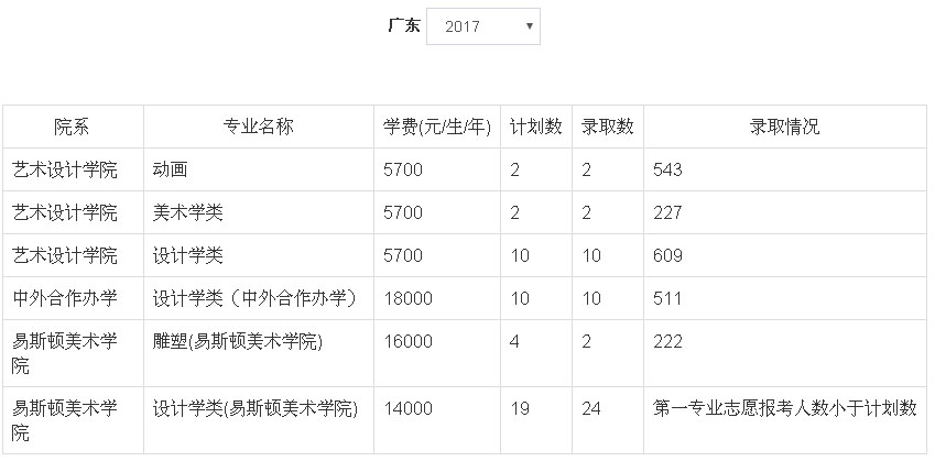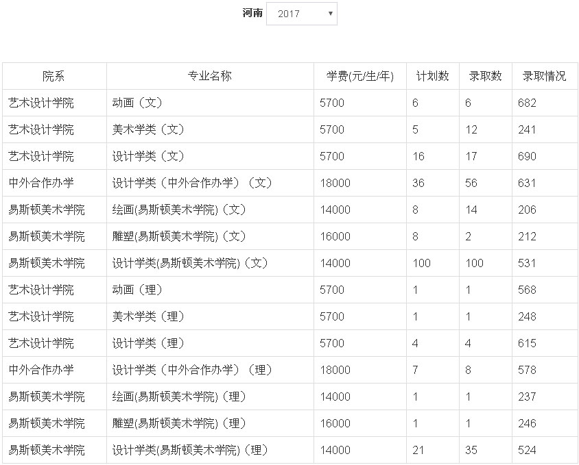 2、2018年我校艺术类本科专业招生采用统(联)考成绩作为专业成绩的省(市、区)为:北京市、天津市、辽宁省、吉林省、安徽省、山东省、河南省、湖南省、广东省、广西壮族自治区、四川省、云南省、陕西省、新疆维吾尔族自治区。招生专业有:动画(学费5700元/生/年)、设计学类(学费5700元/生/年)、美术学类(学费5700元/生/年)、设计学类(中外合作办学,学费18000元/生/年)、设计学类(易斯顿美术学院,学费14000元/生/年)、绘画(易斯顿美术学院,学费14000元/生/年)、雕塑(易斯顿美术学院,学费16000元/生/年),具体以各省级招生主管部门公布为准。