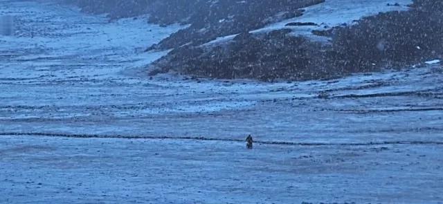 远景当中,环境是主体,人物在画面中所占有的比例非常小,可以用来抒发感情,渲染气氛,创造种意境,特别是孤独、寂寥、悲伤等感受。电影《转山》中,多次出现在这样的远景中,体现出骑行者书豪在旅途中的孤独、无助,而在书豪登上最高峰时候,他坚毅的背影与远处的山峰形成对比,从仰视高山到俯视远山,远景镜头仿佛在诉说一路骑行的不易于艰辛。
