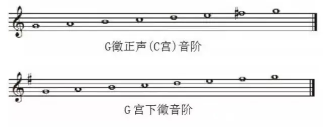 同样,旋律听记也存在这样的问题,最常见的就是调号的规定问题。例如:传统七声调式中主要有正声、下徵 、清商二种音阶,以g徵正声(c宫)音阶与g宫下徵音阶为例,二者音列相同,所以学生在听记旋律的时候,可能会混淆,这导致很多学生往往音准、节奏写的很正确,但是在调号的判断上出现问题,这时就需要运用乐理的知识来解决。谱例见下。