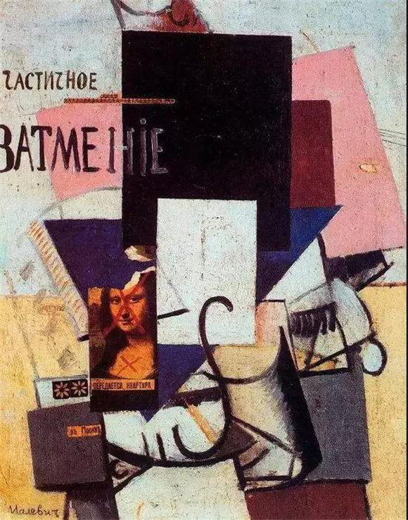 马列维奇 《蒙娜丽莎的创作》;1914年,在布上使用铅笔、油颜料及拼贴,62.5×49.3cm