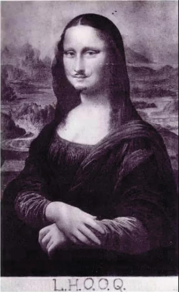 马歇尔·杜尚购买了一幅《蒙娜丽莎》的印刷品并在蒙娜丽莎的脸上勾上了一缕土耳其式的小胡子,这幅戏谑之作被命名为《l.h.o.o.q.》(又名《有胡子的蒙娜丽莎》),“l.h.o.o.q.” 用法语念来是一句粗俗无比的下流话,意为“她的屁股热烘烘”。