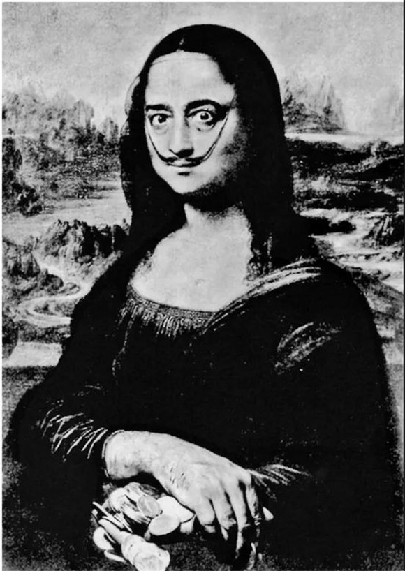 达利把《蒙娜丽莎》变成了一个男人,手里抓满了银币,这样的一种恶搞方式,包括对《蒙娜丽莎》眼神描绘的改变,使得古典主义审美理想的一位女神变成了一个具有达利想表述的一种思想的存在。