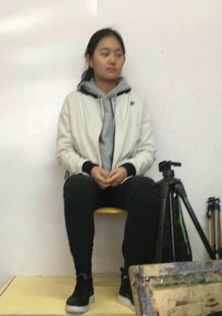 女模特一人,坐姿,肩略向左,双手放大腿上,右手前,左手后。