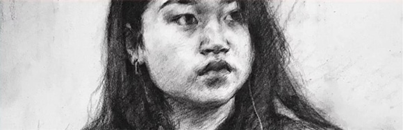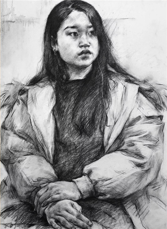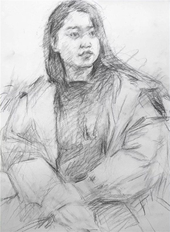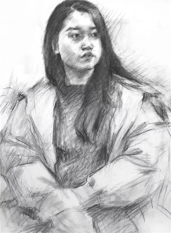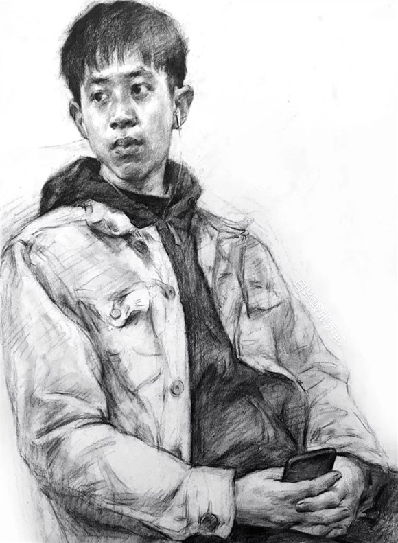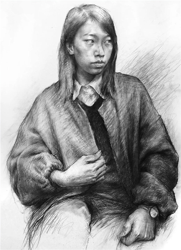 ②第三点就是一定要把头和手练习好,这其中包括骨骼、肌肉、和一些常规动态的练习。特别是手,很多同学不会画手,甚至在有机会写生的时候故意找一些角度去逃避,我们要知道想拿高分手是非常重要的一个环节,千万不能忽略。最后一点是我们可以练习几种衣服的组合。比如说像下面这张作品一样,模特穿了三件衣服,最里面是一件白色衬衫,中间是黑色的毛衣,外面是深灰色的外套。实际模特穿的是什么颜色没有人会去考究,重点是在画面中合理就可以了,这样的黑白灰搭配非常合适,也非常舒服,大家可以学习!