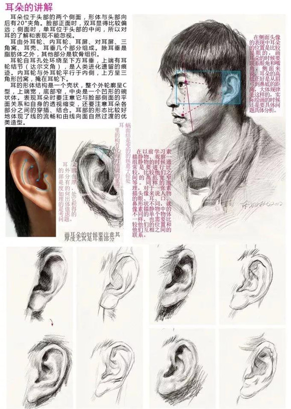 首先,头部下巴的部分会被拉长,脑门的高度会随之变短,注意鼻子底线和耳朵上沿的关系;五官整体会呈现出向上弯曲的弧度的趋势;头部五官的位置会提高,耳朵的位置则会相应降低;还有就是下巴底面的面积会加大,转折较清晰,我们也能看得比较清楚。我们要在掌握正面观察头部的基础之上灵活处理其他角度的变化。