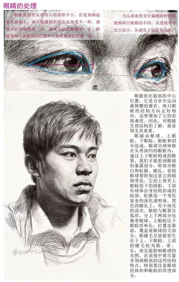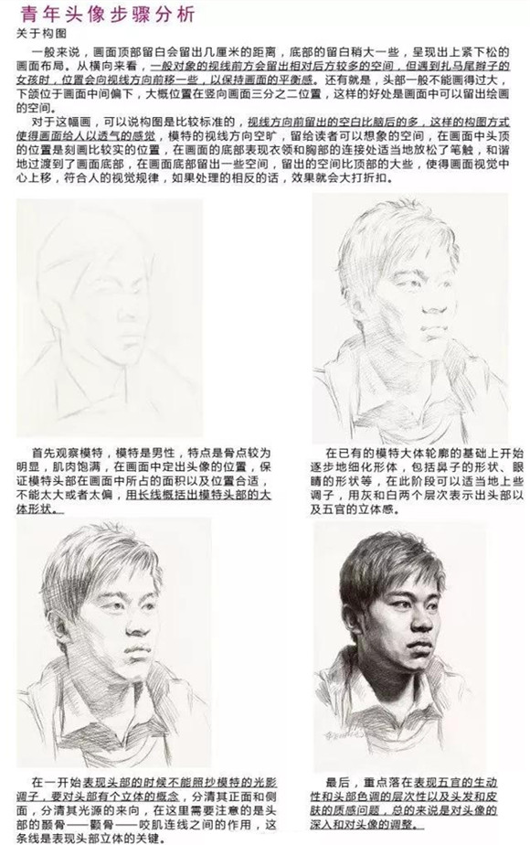 要画好素描头像首先要把握人物形象的特征,在平时训练的时候多留意模特情绪变化时眉、眼、嘴的细微变化。抓住神情最为自然生动时刻进行刻画,使画面充满生气!形神兼备是人物写生的最高要求,但并非是在技巧提高之后才去追求,而应贯穿素描头像的始终。