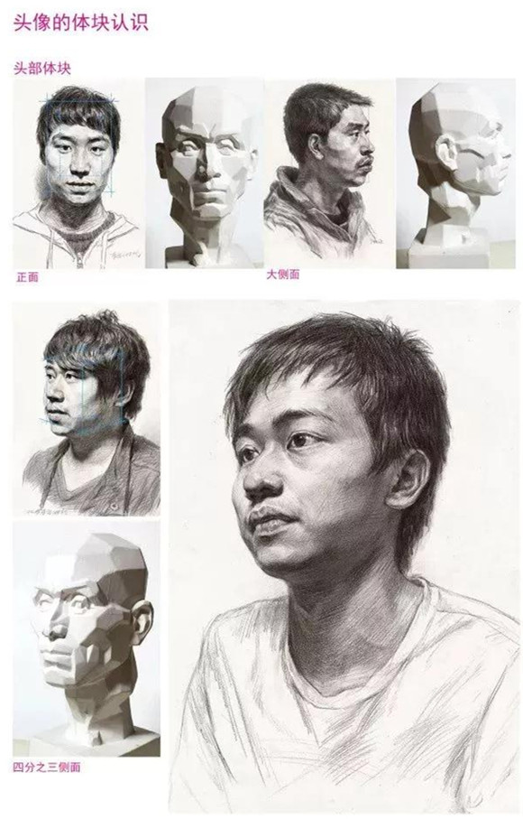 我们在高一点的位置观察人的头部,会出现俯视的效果,我们直观的感觉是脑门变大、变宽了,而下巴却变短、变窄了,感觉头部整个形体向下收进去了。俯视的角度,我们要注意眉毛和耳朵上沿的空间关系;从侧面俯视观察模特,特别要注意鼻子和耳垂的空间关系,眼睛和下巴的空间关系;俯视角度的半侧面是比较难表现的,我们不仅要注意五官排列向下弧度的特点和趋势,还要格外注意五官之间形体所形成的角度关系,这也是帮助我们检查形体准确与否的客观依据。