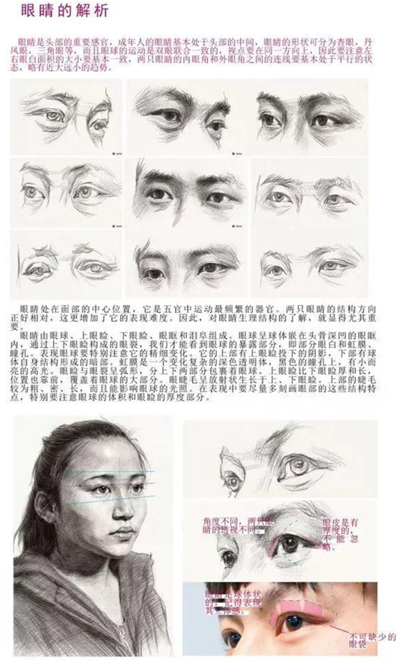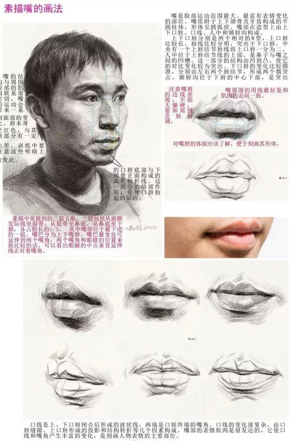 把握这些透视变化,我们首先应确定头部中线、五官辅助线,再以此出发去把握头部运动规律。在把握这一规律时要注意以下几点:一是掌握透视变化规律,如近大远小,视线以上的东西近高远低,视线以下的东西近低远高等;二是了解头部的结构连贯性,头部运动引起结构透视变化,要依靠结构辅助线从中找出变化规律;三是视觉位置的判断力要准确,观察整体透视视角,推断出变化的透视幅度。只要把这三者把握好,无论头怎样运动,都能从中寻出一定的规律。