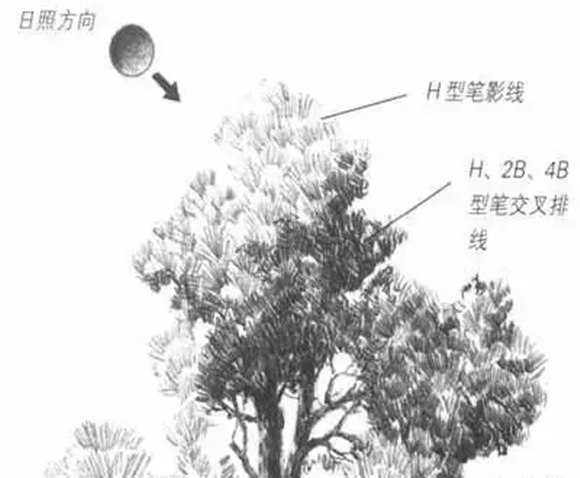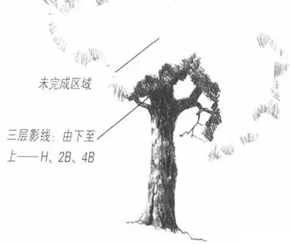 这棵画了一半的树就是用影线和交叉排线构成。再用一些影线和交叉排线.以及随意的笔画就可完成了。