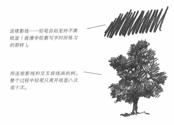 用这些笔法制造阴影效果时,你得注意阴影投向的物体表面的质地。如果表面光滑,一般用细腻的影线比较好。如果表面粗糙,如树皮,那么用稠密的影线(就像前页那棵树)或是有力的交叉排线比较好。