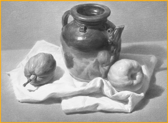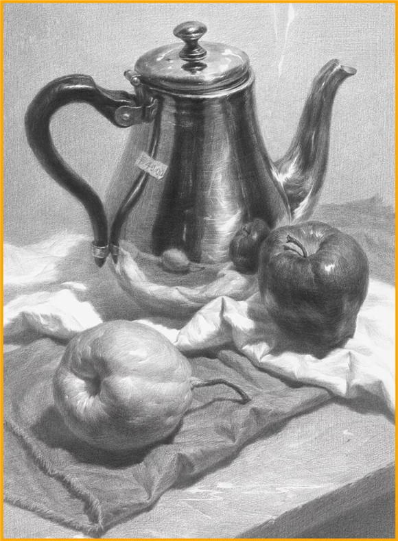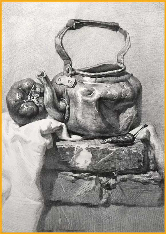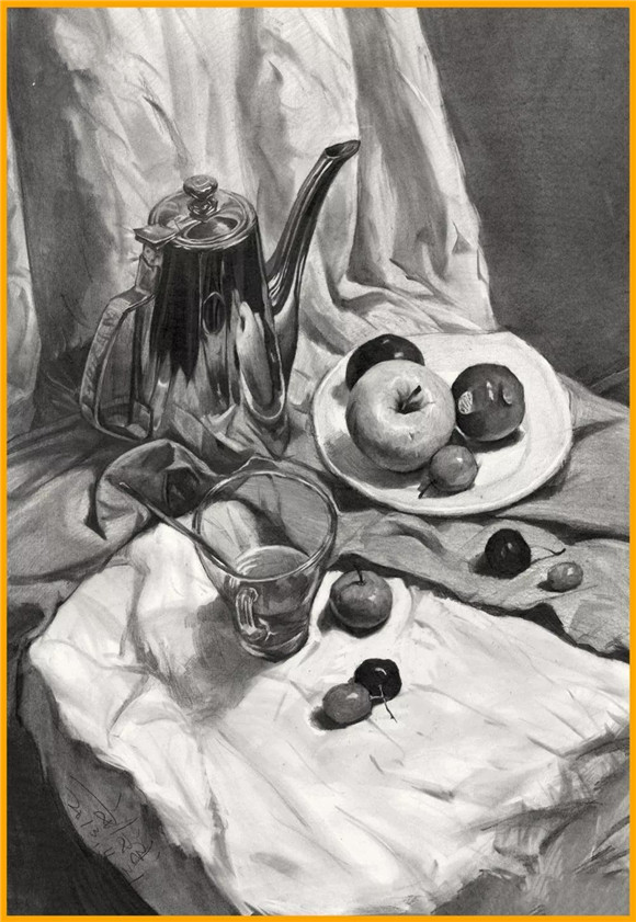 ②下面这张作品中的每一样静物的那种厚重的感觉,非常的扎实,不锈钢水壶以及玻璃杯的质感非常到位,特别是不锈钢水壶上的反光画得很有耐心,画面效果非常好。再看水果的部分就觉得稍微有一点过,质感看上去比较硬,没有水果那种感觉。这是一幅很有功底和实力的素描静物,画了很多时间和精力,我们要学习这种扎实的塑造以及对待画面的态度。