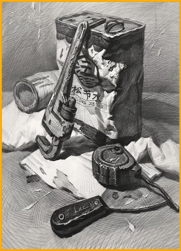 ①说到塑造,我们最需要的练习还是单体练习,其实也很方便,不用构图、处理画面的黑白灰。你随时有时间就可以拿起一个本子开始画,哪怕只打个形也没事,下次有时间再去上调子。画的时候不断想,不断分析结构的变化、转折,调子一点点加重,不要一次性画黑,你会发现单体静物可以画很久,那么应用到画面中也是这样,当你有了塑造的经验之后,画起来就会有条理。