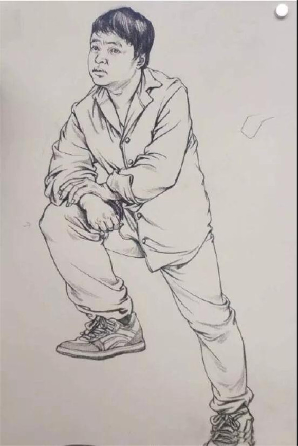 休闲裤相对牛仔裤来说稍微宽松一些,线条也集中在膝盖和裤脚的地方,这幅作品在小腿部分画的非常精彩,用一些虚线和调子的变化把内在的腿形表现得非常好,而不是让调子浮与表面,没有在形体上。