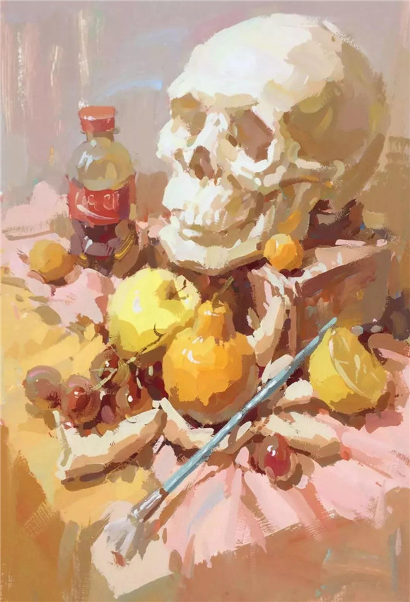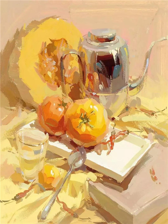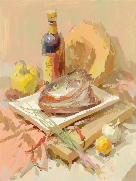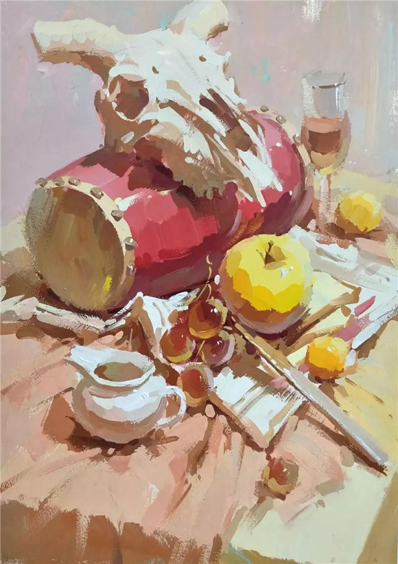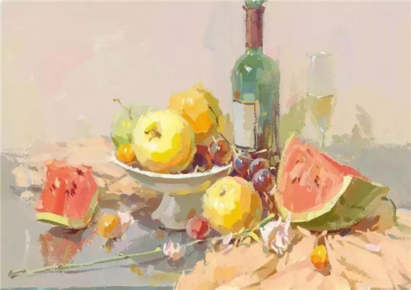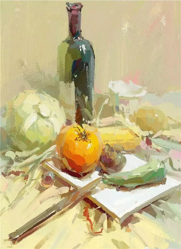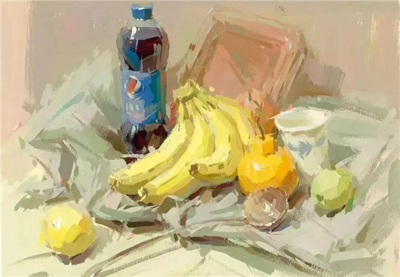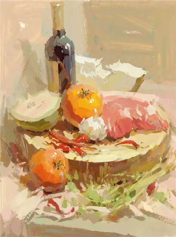 深入刻画是色彩静物默写的艰难时期。这阶段需要从少时写生和临摹中把握各种静物的造型特点,才能充分塑造上体物的形体结构、质感和空间。此时,宜采取厚薄相结合的画法,且注意运用笔触对物体的塑造和一些肌理效果的使用,以增强画面的效果。塑造物体要从大局出发,突出主体,切勿面面俱到。
