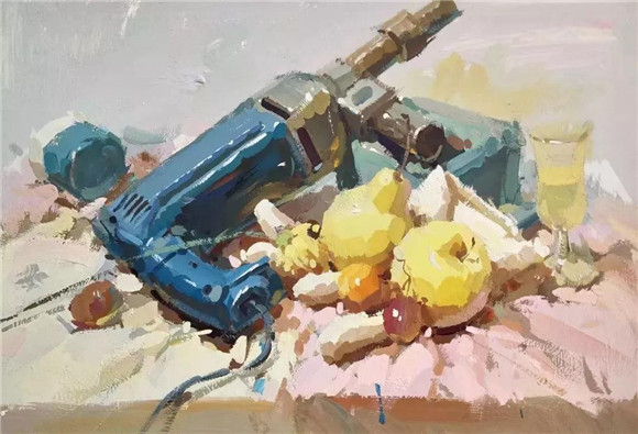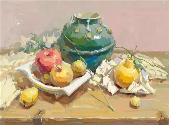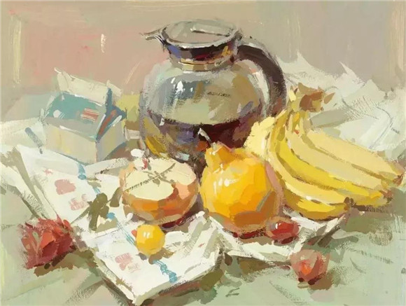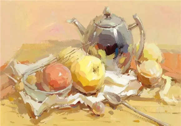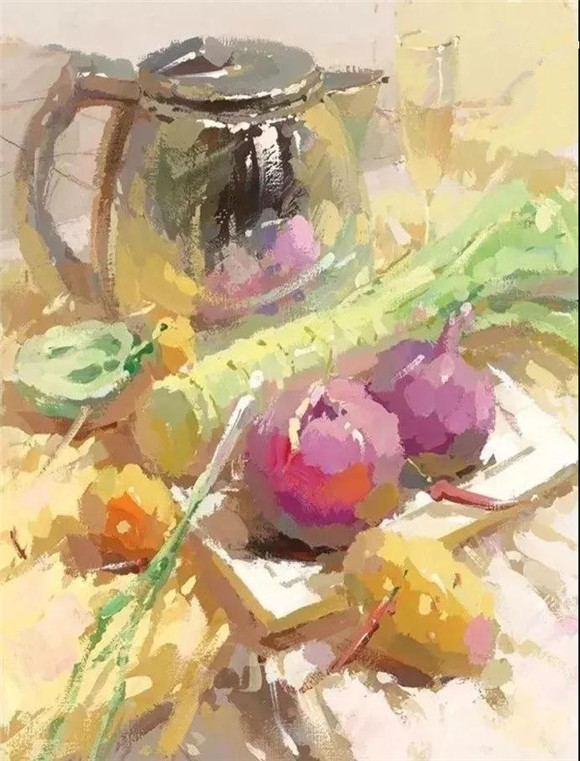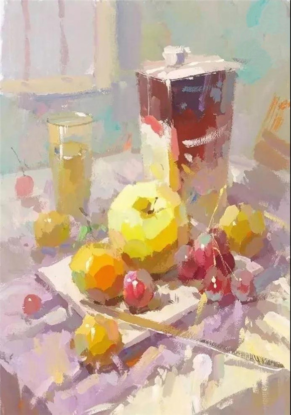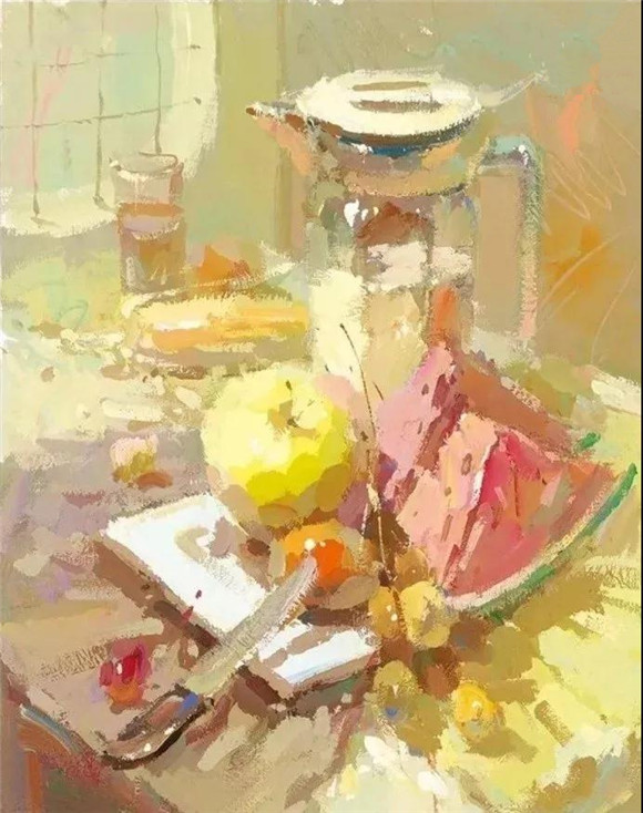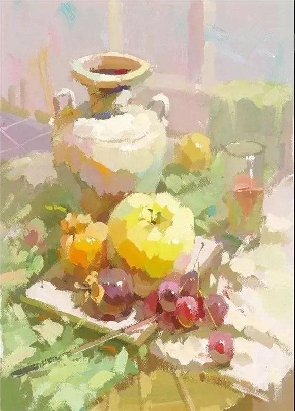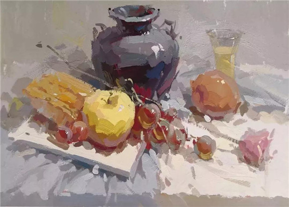 深入刻画是色彩静物默写的艰难时期。这阶段需要从少时写生和临摹中把握各种静物的造型特点,才能充分塑造上体物的形体结构、质感和空间。此时,宜采取厚薄相结合的画法,且注意运用笔触对物体的塑造和一些肌理效果的使用,以增强画面的效果。塑造物体要从大局出发,突出主体,切勿面面俱到。