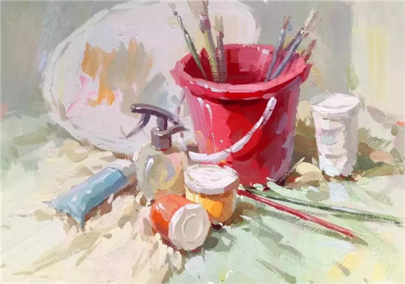 调整时,通常要将后面的物体与前面的物体多做比较,增强层次感和空间感,后面物体的塑造要概括一些,色彩也稍灰一些,前面的笔触要大一些,前面的物体塑造要结实一些,色彩纯度稍高一些,主要物体要多深入多刻画。