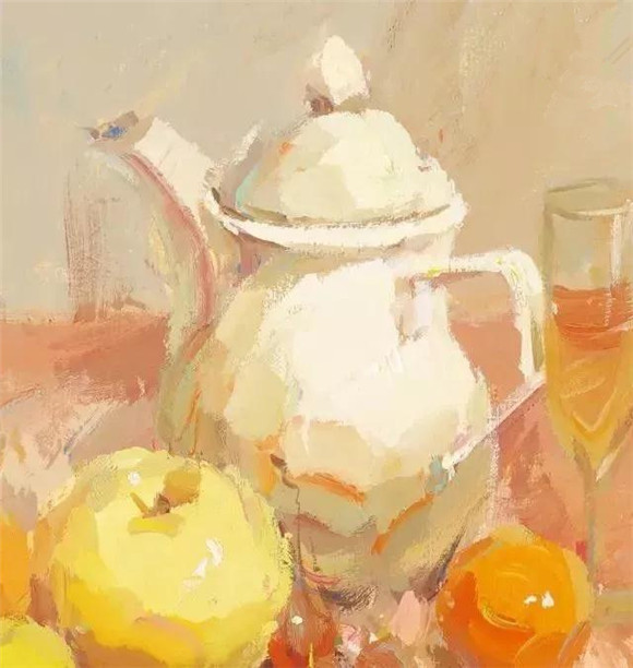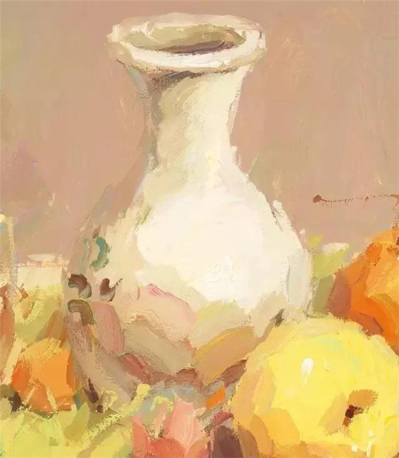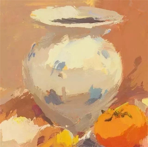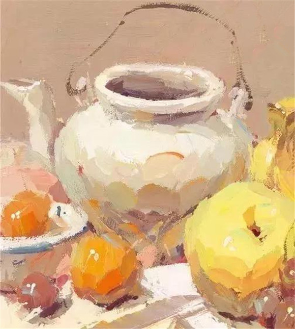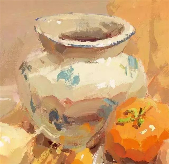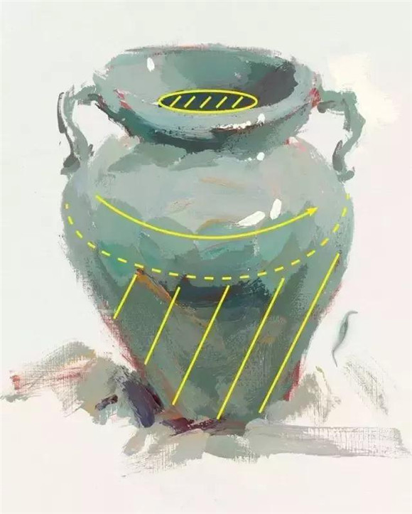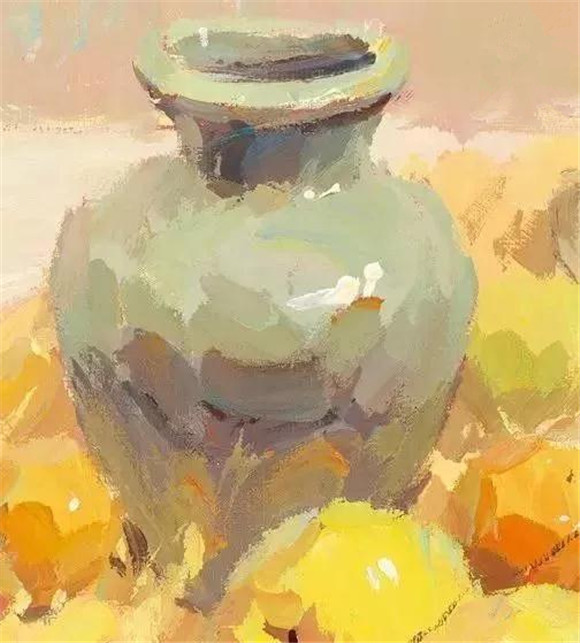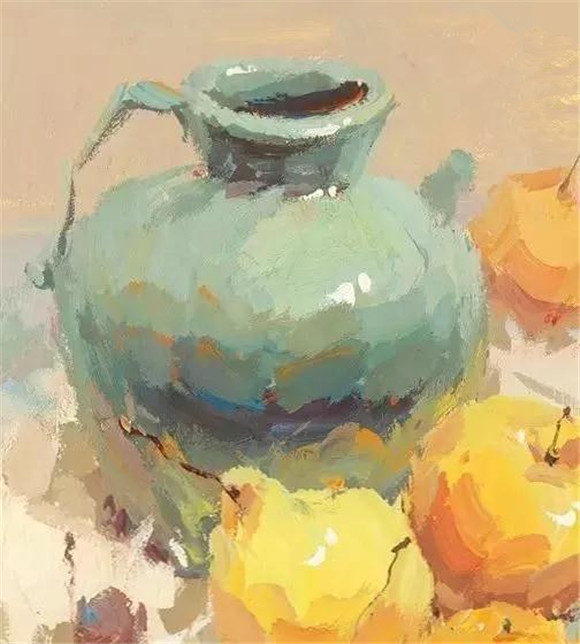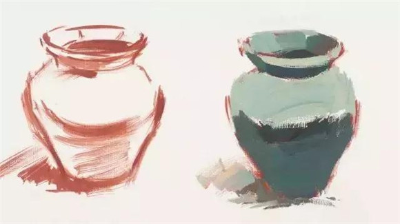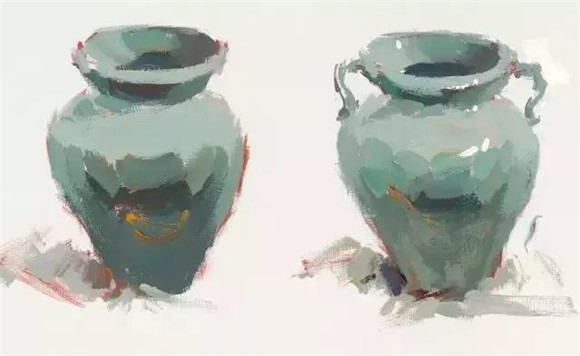 下图中的浅绿色陶罐较为常见,其形体较为简单,类似球体,所以可以根据球体的塑造要点进行表现。注意其大的体积关系以及面与面的转折与衔接。调色时不可掺杂过多颜色,否则容易画得太花,应找准其本身的固有色,再根据物体所受周边环境的程度去表现。并注意罐口的表现,应浑厚而自然。塑造时整体的用笔要灵活多变,使其更富有变化,更具美感。