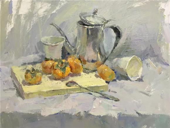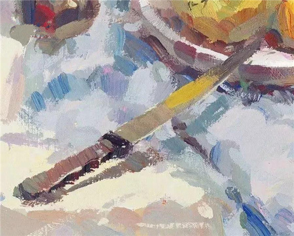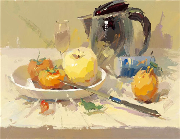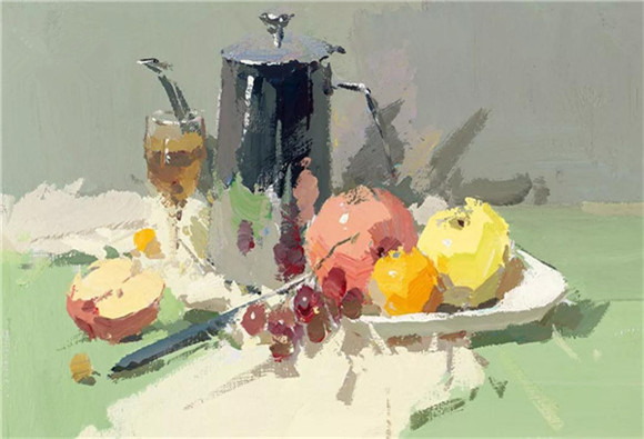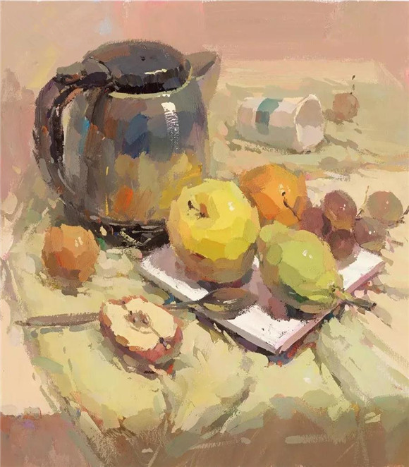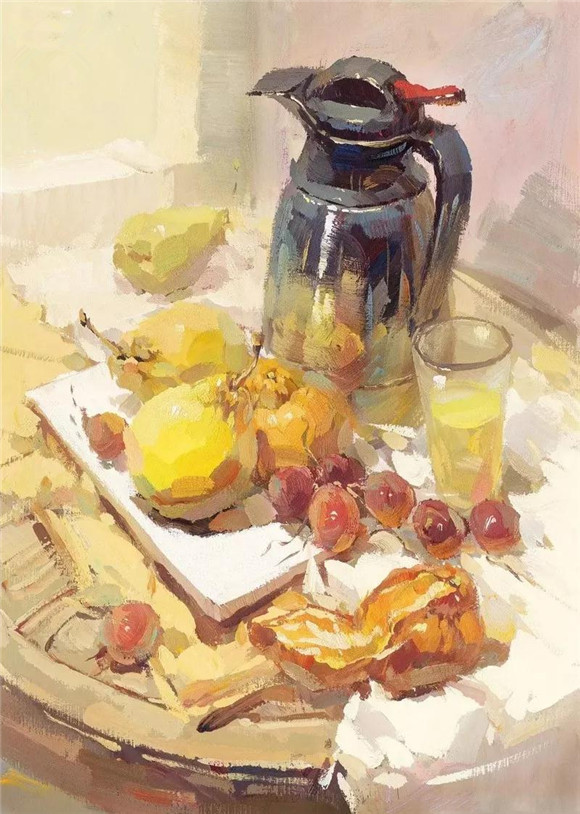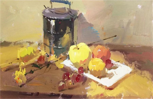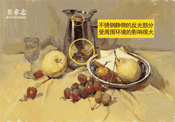 不锈钢器皿-纯不锈钢水壶的画法:在处理纯不锈钢水壶的时候就不用考虑质感的区分了,一般这种静物可以分为几个块面来处理,顶面的盖子部分可以处理成一个灰面,适当区分前后关系即可,水壶的上半部分离静物有一点距离,所以反光会比较弱,一般处理成不锈钢的固有色,重色和灰色还有反光一般都在上半部分,而下半部分的反光会非常强烈,处理的时候注意笔触和颜色不要太花哨。