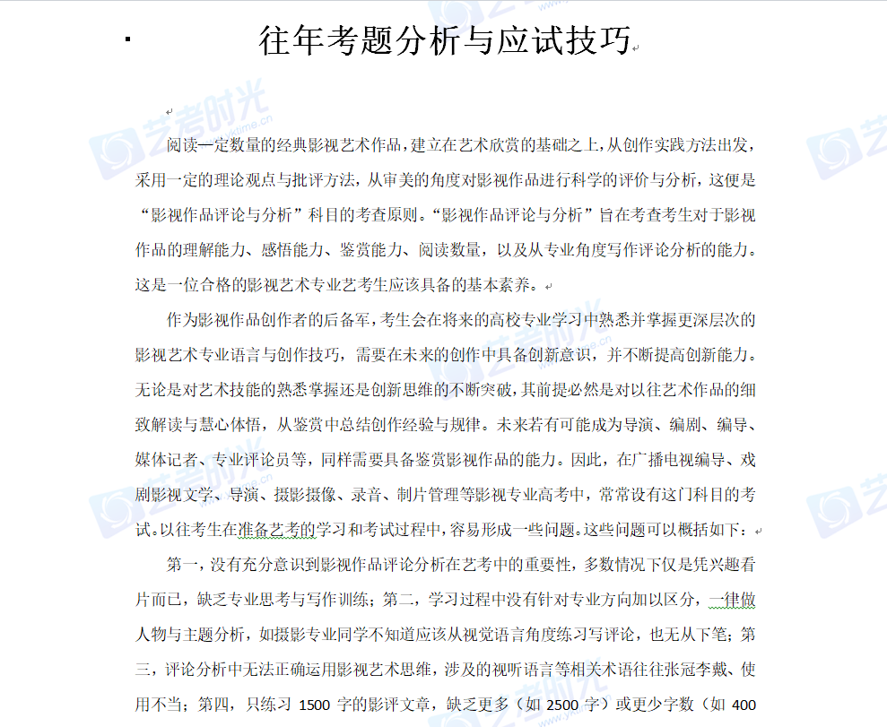 本章将针对以上学习问题做相应的学习指导,从分值比例、不同专业方向的评论分析考查侧重、影视片的常考类型、命题方式(包括考场看片情况、问题形式、字数要求)等方面总结考试特征,以引导考生理解影视作品评论与分析考试科目的相应特点。继而本章将从影视评论基本属性与特征、文章框架等方面初步介绍影视评论分析技巧。编者从专业老师视角,凭借多年教学经验,为考生把握考试动向、命题规则,及时做好应考准备,提供具有针对性的指导。