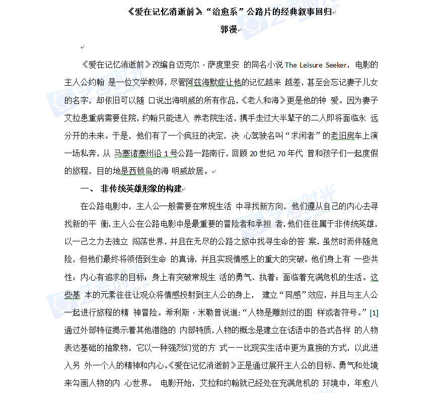 在公路电影中,主人公一般需要在常规生活 中寻找新方向,他们遵从自己的内心去寻找新的平 衡,主人公在公路电影中是最重要的冒险者和承担 者,他们往往属于非传统英雄,以一己之力去独立 闯荡世界,并且在无尽的公路之旅中找寻生命的答 案,虽然时而伴随危险,但他们最终将领悟到生命 的真谛,并且实现情感上的重大的突破。他们身上有 一些共性:内心有追求的目标;身上有突破常规生 活的勇气、执着;面临着充满危机的生活。这些基 本的元素往往让观众将情感投射到主人公的身上, 建立“同感”效应,并且与主人公一起进行旅程的精 神冒险。希利斯·米勒曾说道:“人物是雕刻过的图 样或者符号。”[1]通过外部特征揭示着其他潜隐的 内部特质,人物的概念是建立在话语中的各式各样 的人物表达基础的抽象物,它以一种强烈幻觉的方 式——比现实生活中更为直接的方式,以此进入另 外一个人的精神和内心。《爱在记忆消逝前》正是通过展开主人公的目标、勇气和处境来勾画人物的内 心世界。 电影开始,艾拉和约翰就已经处在充满危机的 环境中,年愈八十,一个老年痴呆,一个身患绝症, 走入生命的黄昏的两个老人又面临即将到来的永远 分离——一个进入养老院,一个在医院度过。然而 看似最应该接受妥协命运安排的两个老人却选择 摆脱儿女的束缚,摆脱医院和养老院的既定命运, 一起踏上去往海明威故居的回忆之旅。他们注定是 一对非常规的英雄,在常规的生活中,他们带着追 寻自由的勇气,打破传统的生活模式,勇敢面对旅 途中未知的风险去实现内心的渴望、选择独特的方 式与世界告别。他们有超常的勇气,这份勇气在旅 程中渐渐内化成主人公性格的一部分,去勇敢的打 破生活的准则、挑战传统社会的既定规则,甚至平 静地面对疾病和死亡。 在电影中,主人公的旅途目标由一系列的空间 或者景观构成,或是人文景观,如西锁岛的海明威 故居;或是自然景观,如旅途中的蓝天绿草、夕阳晚 照、白沙碧海、璀璨星空。主人公追寻的目标或者是 显性或者隐性的,艾拉一再对女儿强调要去做一件 只能和约翰一起完成的事情,表面看这件必须要完 成的事是去开始老夫妻的任性私奔,追忆往昔的美 好时光。旅途中艾拉的豁达开朗,约翰的幽默深情, 每晚夜幕降临后的幻灯片,一幕幕过往闪过宛如时 间之旅。而一路上各种荒诞不经的场景失散、尿床、 多年的情敌记忆,将他们何以携手走过大半生通过 跌跌撞撞的旅程展现得淋漓尽致。影片的末尾也揭 示了这趟旅途的隐性目标。1961年,海明威选择了 在家中用猎枪身杀自亡。将海明威故居作为旅途终 点的主角,他们面对死亡的时候也选择了“海明威 式”的自由。轰轰烈烈也好,嬉笑怒骂也好,最后都趋于平静面对生命尽头的告别,主人公在路上渐渐 领略到自己的灵魂所真正追寻的价值,也为生命画 下了完美的句点。