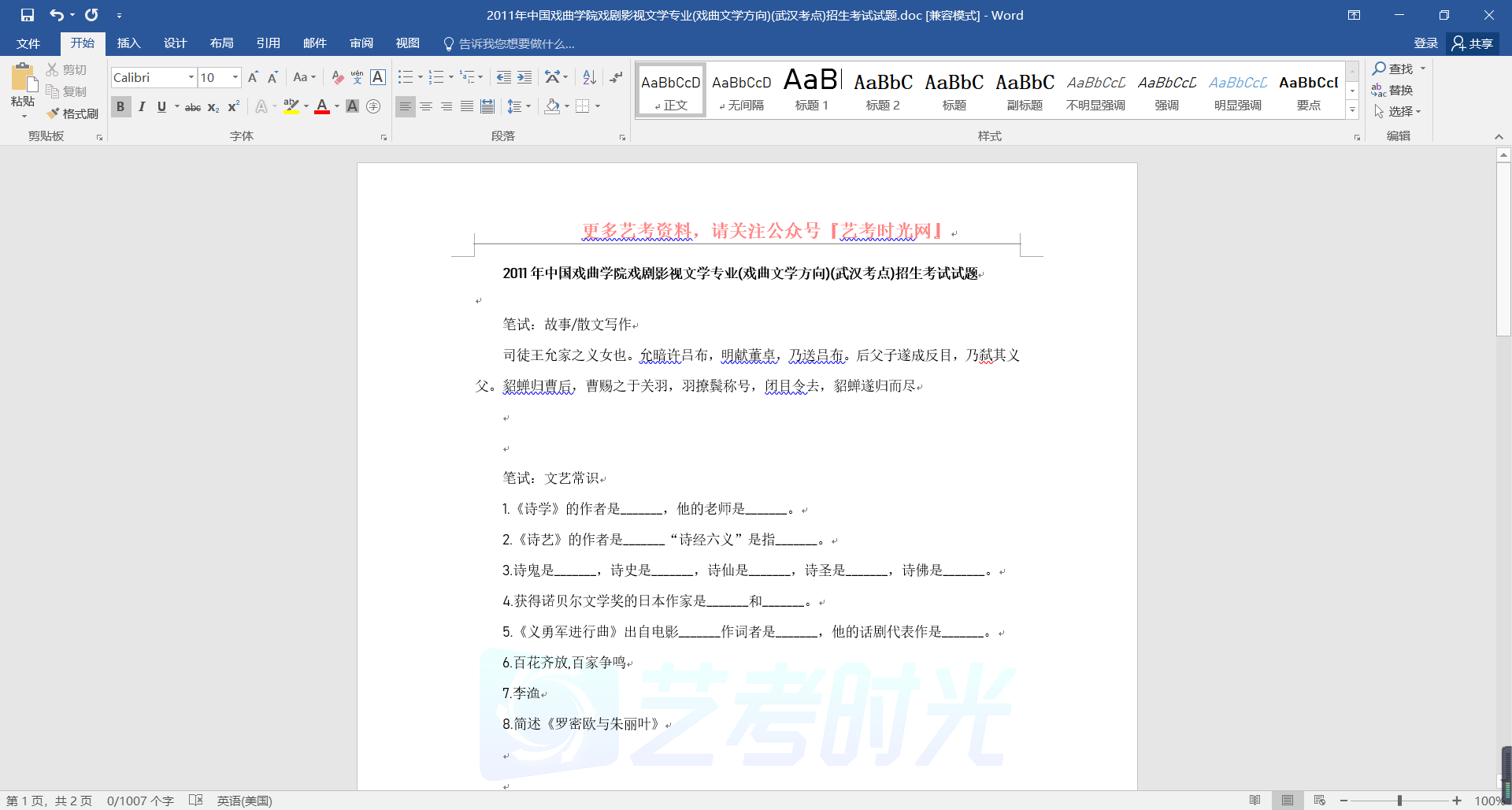 2011年中国戏曲学院戏剧影视文学专业(戏曲文学方向)(武汉考点)招生考试试题