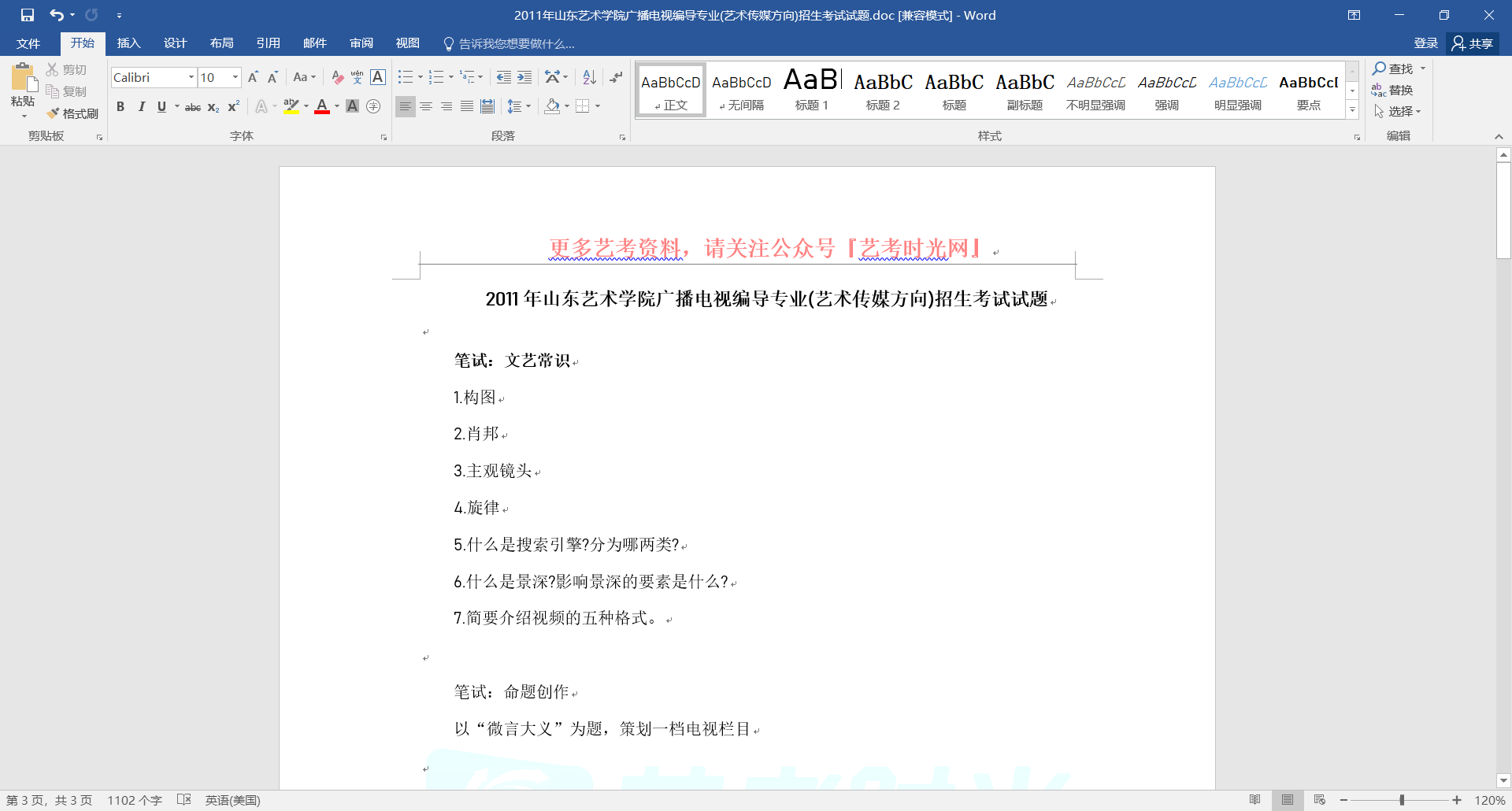 2011年山东艺术学院广播电视编导专业(艺术传媒方向)招生考试试题