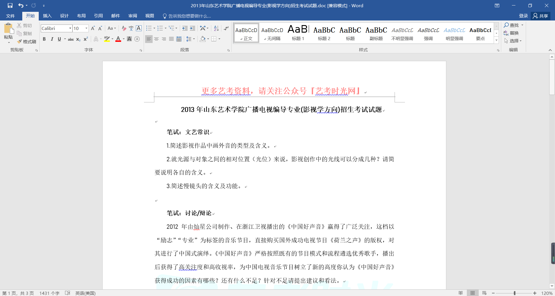 2013年山东艺术学院广播电视编导专业(影视学方向)招生考试试题