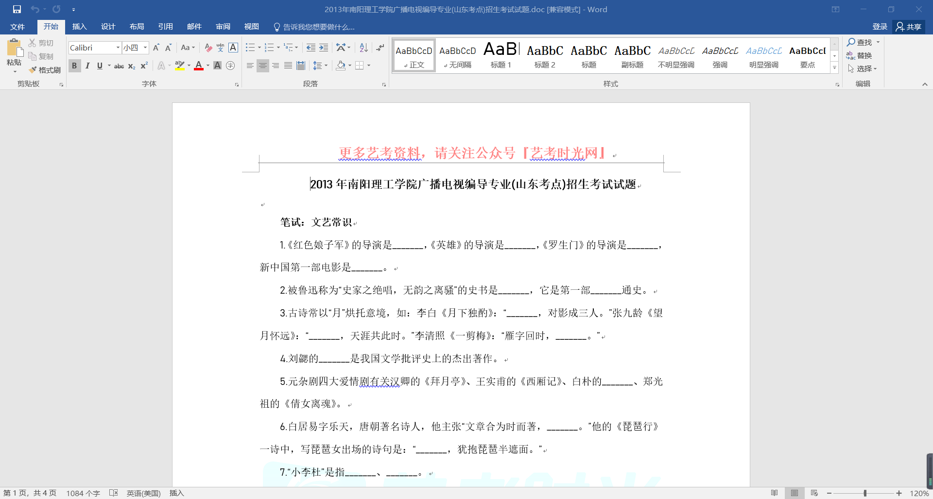 2013年南阳理工学院广播电视编导专业(山东考点)招生考试试题 笔试:文艺常识 1.《红色娘子军》的导演是_______,《英雄》的导演是_______,《罗生门》的导演是_______,新中国第一部电影是_______。 2.被鲁迅称为“史家之绝唱,无韵之离骚”的史书是_______,它是第一部_______通史。 3.古诗常以“月”烘托意境,如:李白《月下独酌》:“_______,对影成三人。”张九龄《望月怀远》:“_______,天涯共此时。”李清照《一剪梅》:“雁字回时,_______。” 4.刘勰的_______是我国文学批评史上的杰出著作。 5.元杂剧四大爱情剧有关汉卿的《拜月亭》、王实甫的《西厢记》、白朴的_______、郑光祖的《倩女离魂》。 6.白居易字乐天,唐朝著名诗人,他主张“文章合为时而著,_______。”他的《琵琶行》一诗中,写琵琶女出场的诗句是:“_______,犹抱琵琶半遮面。” 7.“小李杜”是指_______、_______。 8.马致远的_______中,“夕阳西下,_______“抒发了作者的羁旅之思。 9.蒲松龄的《聊斋志异》和曹雪芹的_______,堪称中国古典小说创作上的“双璧”。 10.法国作家巴尔扎克的作品_______成功塑造了著名的吝啬鬼形象。 笔试:单选题 1.“游刃有余”出自( )。 a《韩非子》 b《庄子》 c《左传》 d《老子》 2.“小谢”是指( )。 a谢灵运 b谢朓 c谢飞 d谢安 3.豪放派词人是( )。 a苏轼 b温庭筠 c柳永 d李清照 4.四大名著中不正确的情节是( )。 a诸葛亮拒过江东 b唐僧取经 c鲁智深倒拔垂杨柳 d刘姥姥进大观园 5.叶圣陶的作品是( )。 a《京城风云》 b《子夜》 c《祝福》 d《稻草人》 6.张承志的作品是( )。 a《边城》 b《围城》 c《家》 d《黑骏马》 7.以下作品、作者、国家和体裁正确的是( )。 a《堂吉诃德》一塞万提斯一葡萄牙一小说 b《上尉的女儿》一普希金一俄国一小说 c《警察与赞美诗》一惠特曼一美国一小说 d《威尼斯商人》—莎士比亚一英国一诗歌 8.属于莎士比亚四大悲剧的是( )。 a《罪与罚》 b《吝啬鬼》 c《哈姆雷特》 d《仲夏夜之梦》 9.《羊脂球》《战争与和平》《伪君子》的作者分别是( )。 a莫里哀、阿•托尔斯泰、塞万提斯 b欧•亨利、列夫•托尔斯泰、卡夫卡 c莫泊桑、列夫•托尔斯泰、莫里哀 d契诃夫、阿•托尔斯泰、莫里哀 10.下列属于魔幻现实主义的作品是( )。 a《百年孤独》 b《红与黑》 c《玩偶之家》 d《老人与海》 笔试:影视作品分析 观看纪录片《复活的军团》第一集《王者归来》,从内容和视听语言方面进行分析,题目自拟,1000字左右。