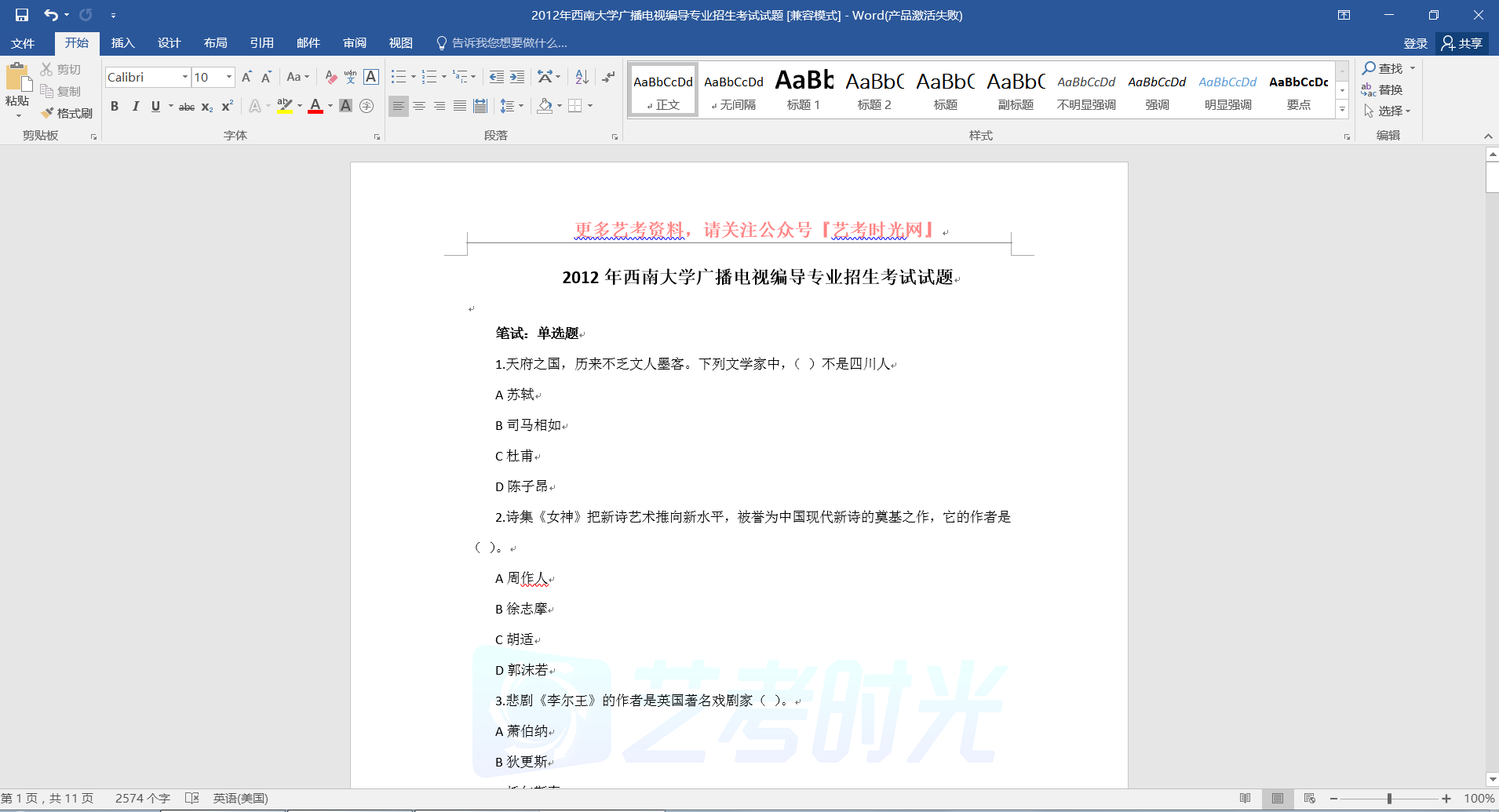 1.天府之国,历来不乏文人墨客。下列文学家中,( )不是四川人