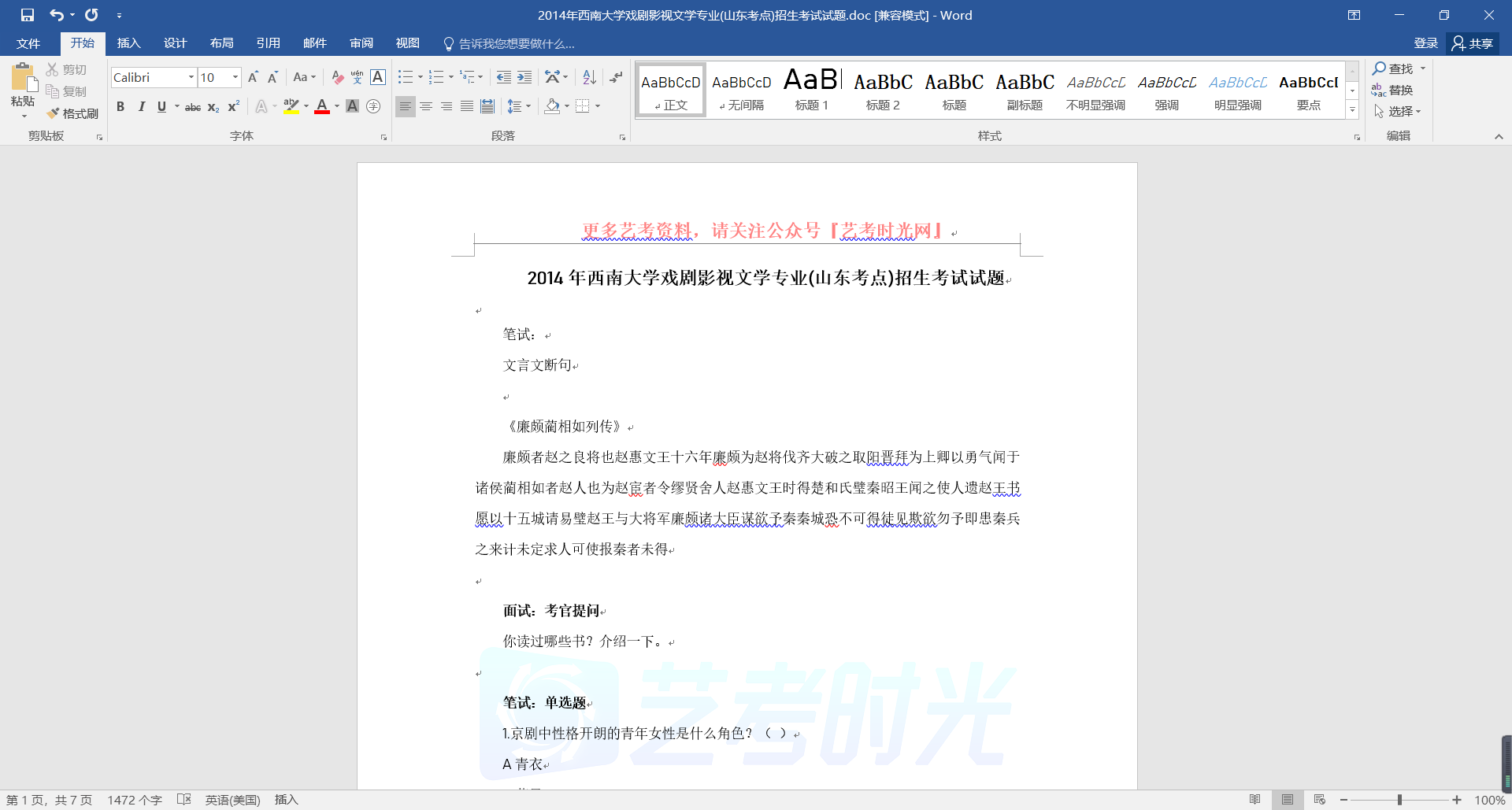 2014年西南大学戏剧影视文学专业(山东考点)招生考试试题