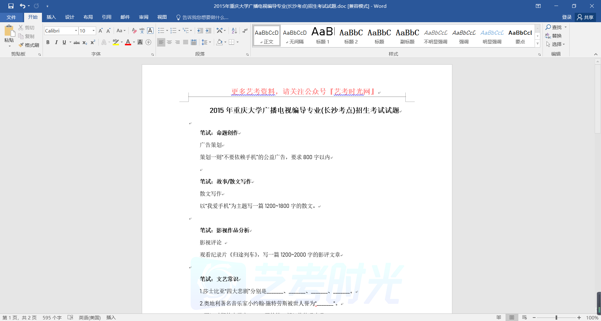 2015年重庆大学广播电视编导专业(长沙考点)招生考试试题